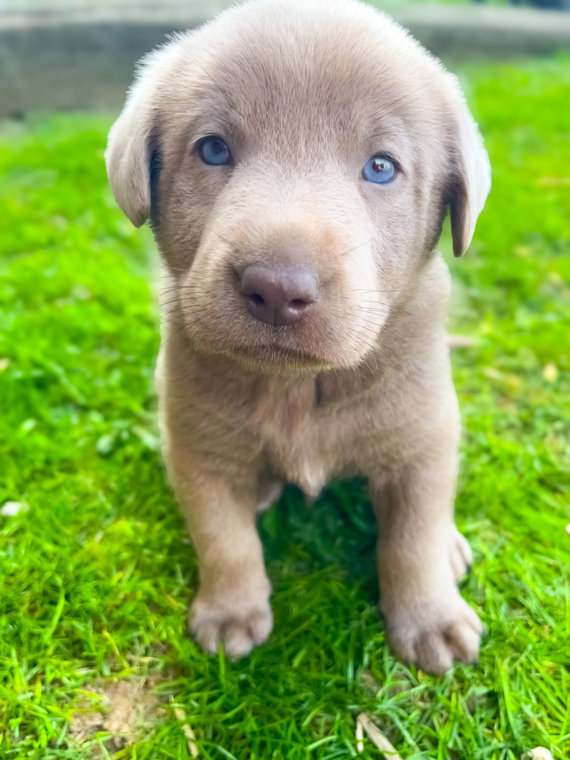 Penny is my baby. She is the best dog I've ever had. Penny is smaller at 70lbs. She has never needed a leash, even at the vet with other dogs. She comes to a whistle; she is wonderful with my kids. Any time I sit my 9-month-old on floor to play; Penny always comes and sits right next to her against her back. She is not as active as Tanner or Harley. Penny is older. She prefers to walk around the property and stay near the kids. She has to sleep in bed with me every night. Penny is perfect; she is a dream dog. Penny is an English lab with the boxy head and shorter legs, she makes puppies with the beautiful boxy head, blue eyes and soft silver coat.